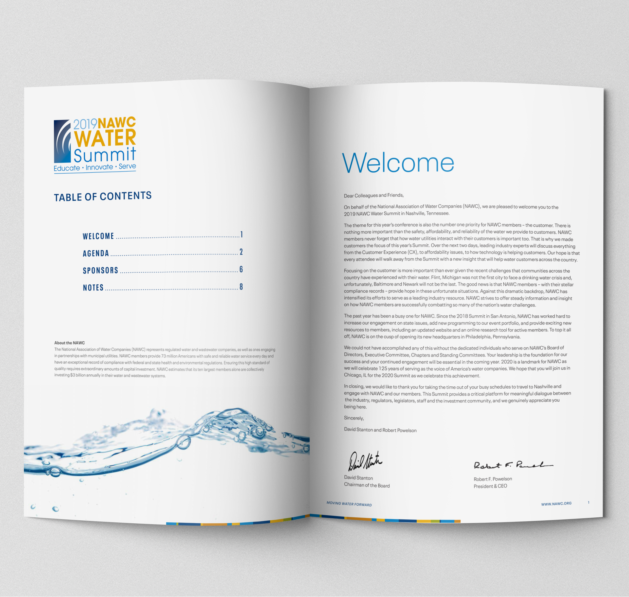 National Association of Water Companies (NAWC) Summit materials VSGD designed and produced the National Association for Water Companies annual summit print and digital materials after understanding their conference branding needs and audience. Share this: Share on LinkedIn (Opens in new window) LinkedIn Related